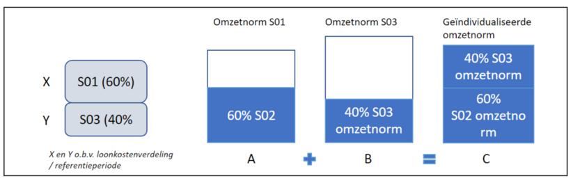 Wanneer er een 1-op-1 relatie te leggen is tussen kostenplaats en setting, kan de normomzet worden berekend aan de hand van de loonkostenverdeling voor behandelaren die op meerdere kostenplaatsen actief zijn. Bijvoorbeeld: medewerker A met beroep III werkt 50% op kostenplaats X (setting S02 – normomzet per dag = 800,-) en 50% op kostenplaats Y (setting S03 – normomzet per dag = 1000,-). De normomzet voor deze medewerker bedraagt (50% * 800,-)+ (50% * 1000,-) = 900,-