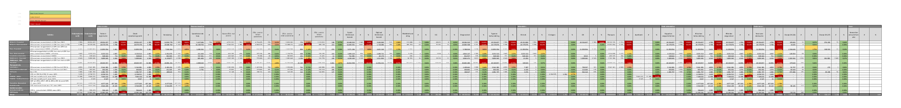 Vanwege bovenstaande reden is ervoor gekozen om geen filters toe te passen op de scope. Alle Zorgproducten (ZP) en Overige Zorgproducten (OZP) die voor het laatst gefactureerd zijn in het betreffende kalenderjaar zijn daarom meegenomen. Deze massa is niet bevroren, omdat er op een later tijdstip een product gecrediteerd kan worden, waardoor het product buiten de massa valt. Dit betekent dat de massa in dit overzicht een momentopname is en kan blijven fluctueren in zekere mate. De kwantitatieve risicobepaling is niet bedoeld om een data-aansluiting om te maken, hiervoor dient het dashboard 'Horizontaal Toezicht (HT) - Data aansluiting' gebruikt te worden.